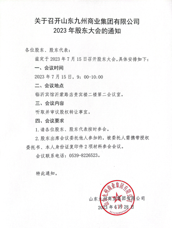 關于召開山東九州商業(yè)集團有限公司2023年股東大會的通知 |