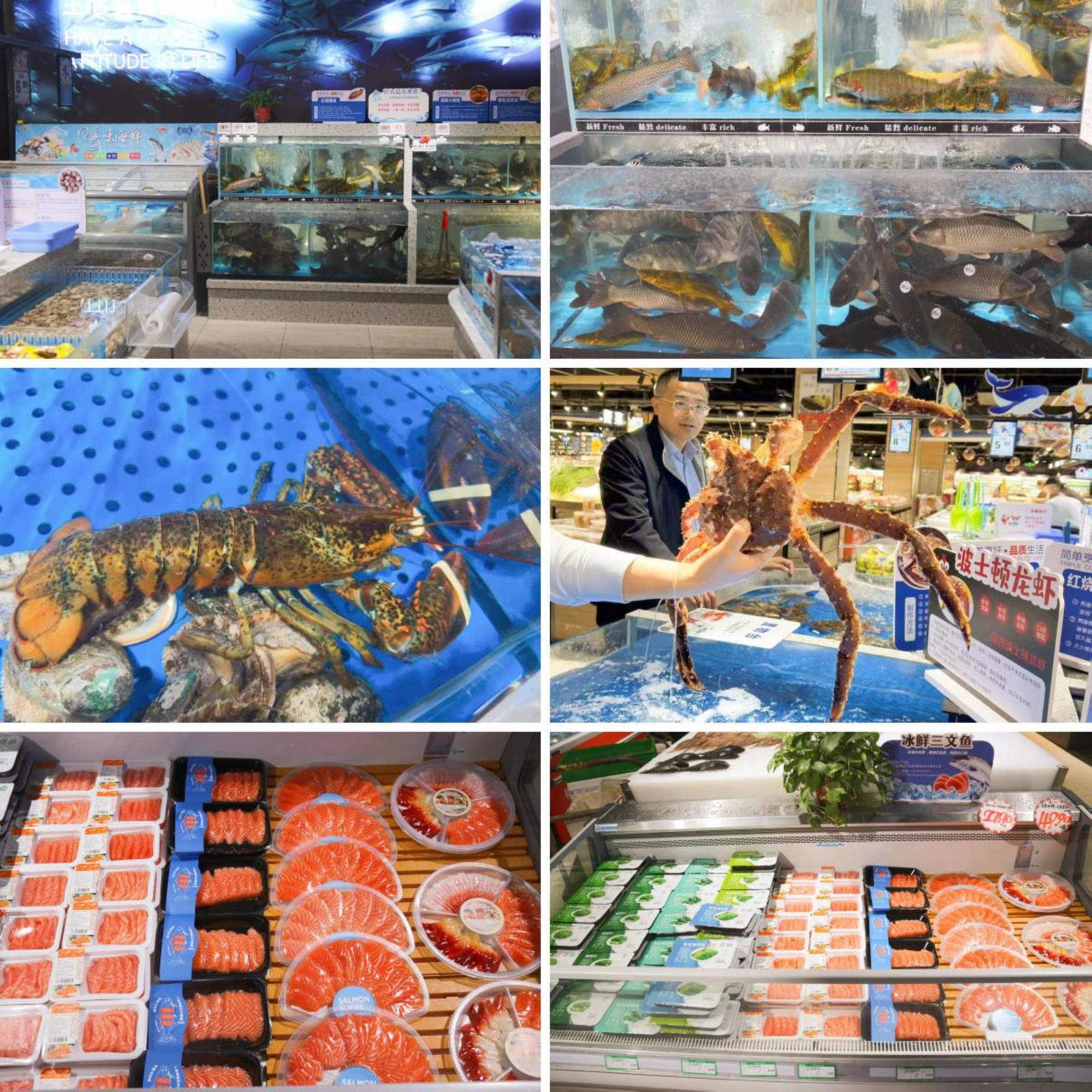 水產(chǎn)區(qū)設(shè)備全部煥新,引進(jìn)帝王蟹、珍寶蟹、波士頓龍蝦、多寶魚、石斑魚、吊水虹鱒魚、冰鮮三文魚等鮮活水產(chǎn)品,并通過全程冷鏈直達(dá)門店,將新鮮送到消費(fèi)者手中。
