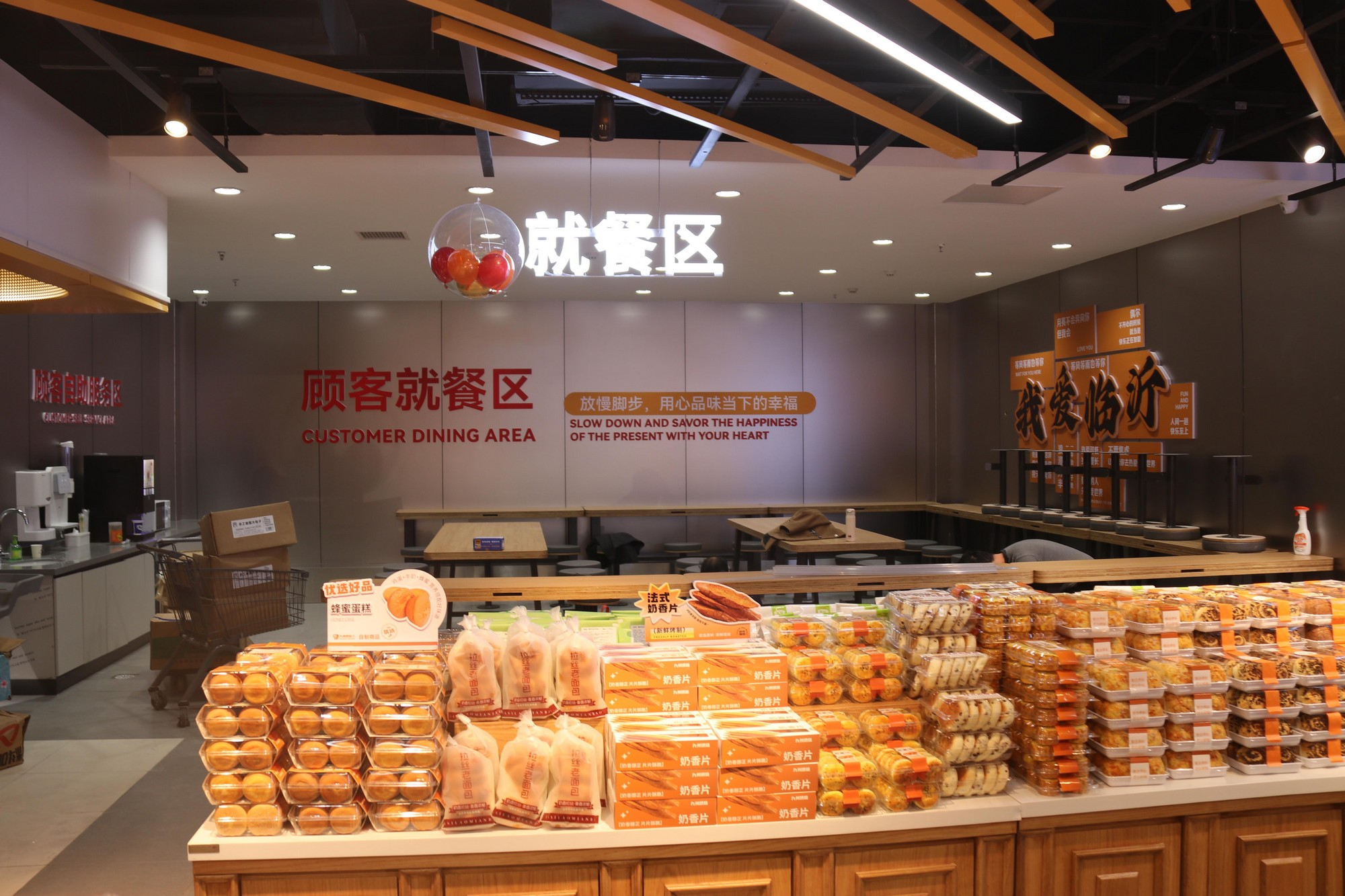 除品類擴(kuò)容外,門店還新增顧客就餐區(qū),打破了“逛”與“吃”的場景邊界,搭配自助咖啡機(jī)、自助豆?jié){機(jī)等服務(wù)設(shè)備,讓消費(fèi)者在購物間隙即可便捷享受美食。
